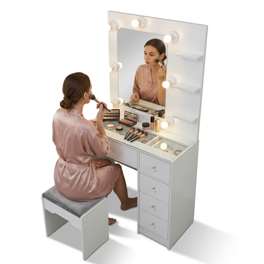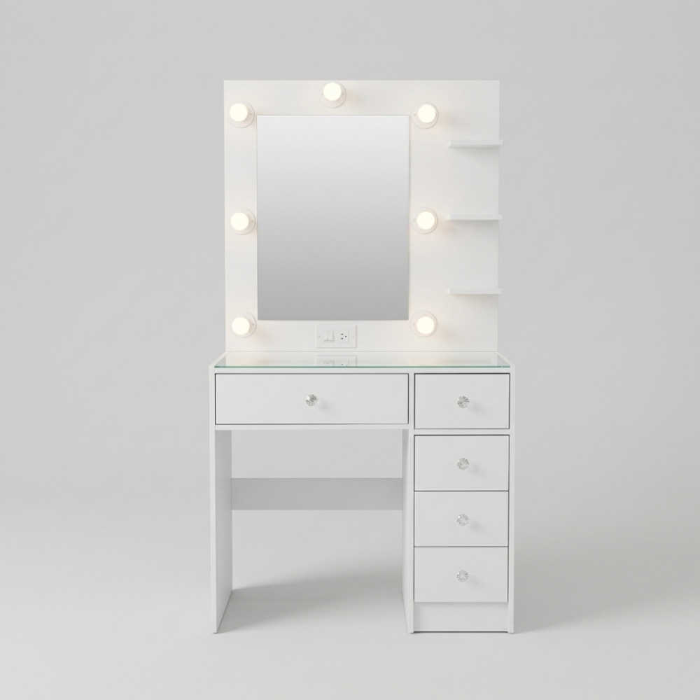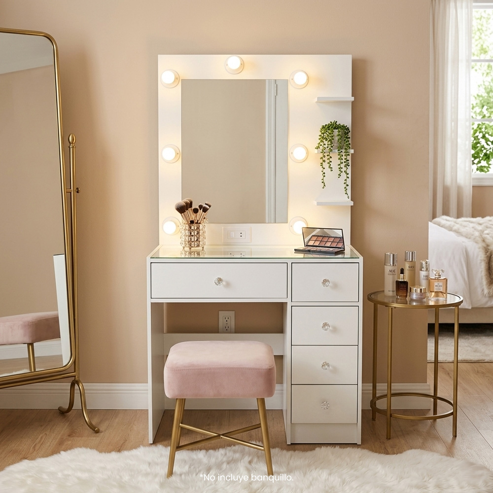 El Tocador Hollywood 5 Cajones combina estética, iluminación profesional y funcionalidad de almacenamiento de alta calidad, creando el rincón de belleza de tus sueños.