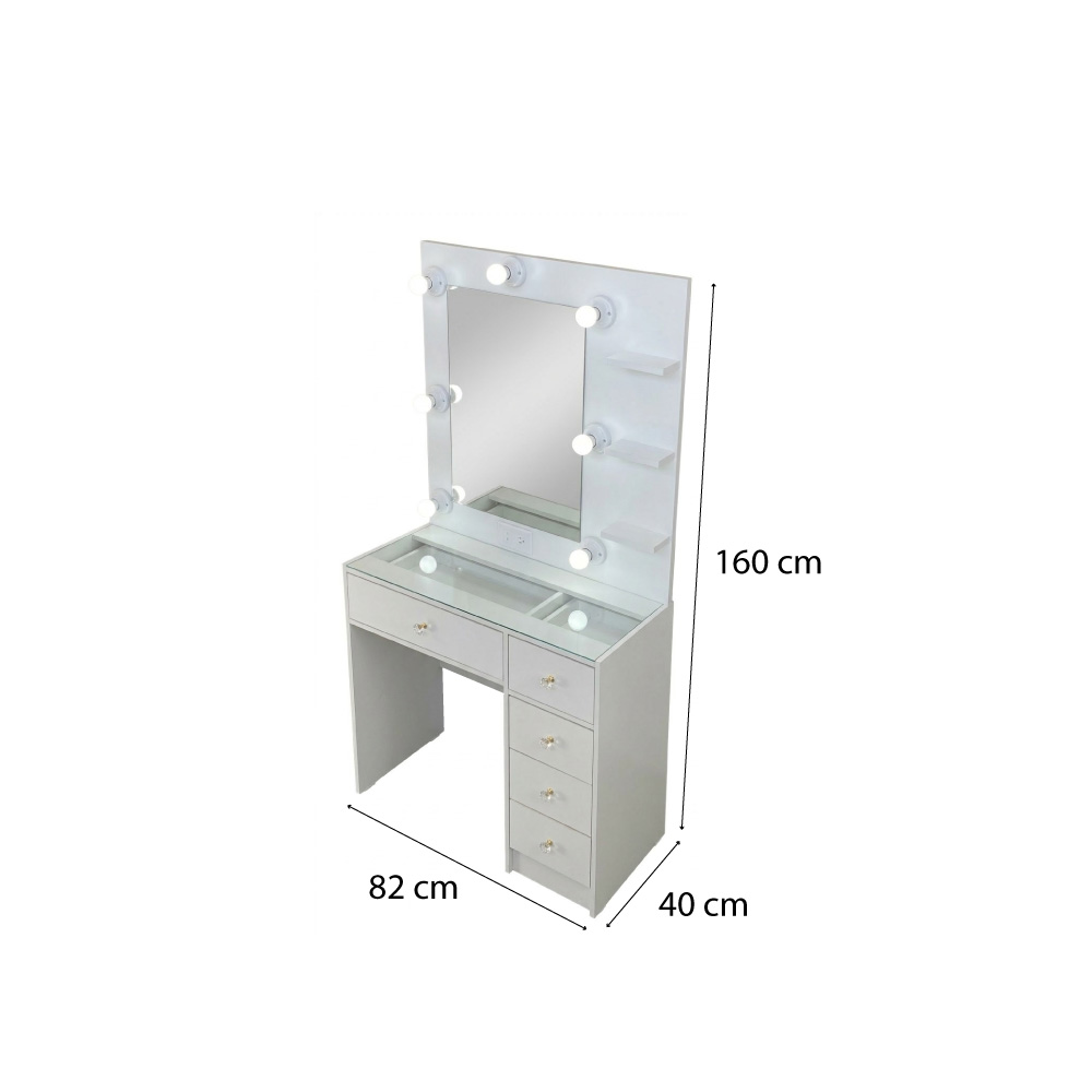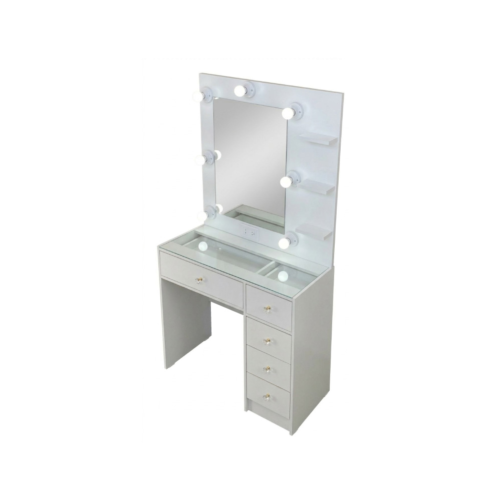 Este elegante y funcional tocador de estilo Hollywood es la pieza central perfecta para tu espacio de maquillaje o vestidor. Su diseño moderno en color blanco brillante no solo añade un toque de glamour, sino que también ofrece la organización y la iluminación profesional que necesitas.